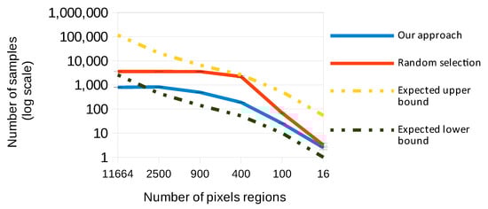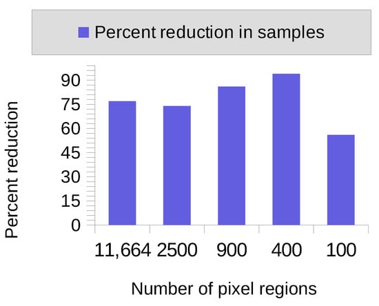 Figure 8 shows the decrease in the number of samples required to achieve full feature coverage by different levels of quantization (different number of pixels/regions). The case with 16 regions is not included in Figure 8 because both results are 2 images, so there is no reduction. For others, the results oscillate between and .