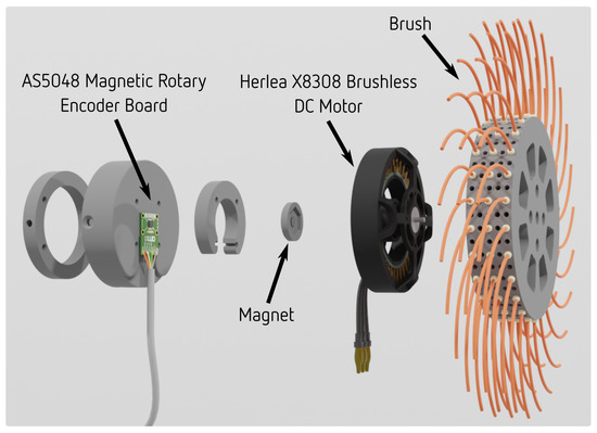 An exploded view of the developed suckering tool is shown in Figure 3. The tool consists of a circular brush mounted on a brushless DC motor with a magnetic encoder. The brush itself has plastic bristles which serve to remove the buds from the plant. High-performance brushless motor control board ODrive is used for low-level control. Brushless DC motor Herlea X8308 is chosen because of its geometry and characteristics. Its small length and large radius result in high torque density, as discussed in [28].