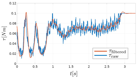 Raw torque signal calculated from current measurements (), and the filtered torque signal, output from the alpha–beta filter ().