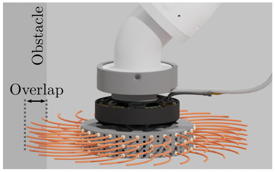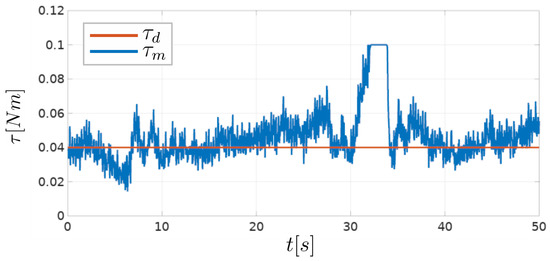 It is worth noting that even if there is no overlap between the brush bristles and the obstacle, a certain amount of torque is measured by the tool, as shown in Figure 6. This amount depends on the particular tool design, more precisely, on its moment of inertia. The choice of the desired value of the resistance torque should be based primarily on the execution of the task itself, but also take into account the minimum and maximum values of the torque measured by the tool. The choice of in this paper was guided by the idea that the desired torque value should roughly correspond to the middle of the feasible overlap values, as seen in Figure 6. Since the feasible overlap values are limited, a desired torque value near the upper or lower overlap limit would cause unsatisfactory controller performance in one of the directions (when the measured torque increases or decreases).