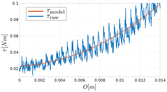 During the experiment, the forward position of the tool and the brush-shaped tool current are measured. An obstacle overlap, denoted as O, is calculated using forward kinematics and encoder measurements. The relationship between the obstacle overlap and the torque calculated from motor current measurements is shown in Figure 6.