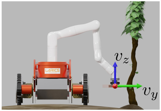 where A is the sine function amplitude, f is the frequency, and t is current time. A sine function is used to achieve simple periodic movement in the vertical direction. As seen in Figure 8, movement in the forward direction (y-direction) is used to remain in contact with the plant, or, more precisely, to control the overlap between the brush and the plant, while the movement in vertical direction is used to cover a portion of the height of the trunk. The footage of the experiment can be seen in the accompanying video (https://youtu.be/5OMa_ViNi7M, accessed on 29 November 2022).