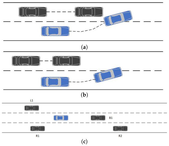 Figure 2a shows a forced lane change for the rear car’s aggressive style may result in a collision. It is easy to avoid a collision with a conservative style, as shown in Figure 2b. Driving styles were classified as aggressive, normal, or conservative. The aggressive type of rear car should avoid changing lanes, the ordinary type could be taken to change lanes or not, and the conservative type could safely change lanes.