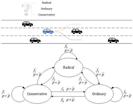 denotes the weights obtained by training the classifier, where . denotes whether satisfies the computed metric, with a value of 0 or 1. The driving style was predicted by inferring high-level information from low-level data, namely the experimental calculated value and the parameter index. Figure 3 is an example of a dynamic structural representation of a risk model, containing aggressive, conservative, and ordinary types, which were transformed between them by an identification function, and entering a state triggered a reset condition that reset the probabilities.