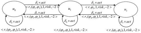 Another study [14] combined interpretable rule-based policies and black-box reinforcement learning to achieve system safety and robustness. Krasowski [15] used an ensemble-based approach to enhance the safety of reinforcement learning by extending the reinforcement-learning safety layer to limit the action space. Wachi et al. [16] proposed a reinforcement learning method with a constrained Markov decision process, which continuously learned security constraints by extending the security region. Bastani et al. [17] proposed a method for learning and verifying decision tree strategies. In the DRL field, strategy verification to a large extent belongs to the category of neural network verification. Strategy verification is usually used to explain the learned strategies after training. Some studies [18,19] combine temporal logic and automata to solve the non-Markov reward decision process, while other studies [20,21] use the robustness of signal sequential logic to stimulate the learning process. Wen et al. [22] combined the maximum likelihood IRL with a task constraint in the form of common safety linear sequential logic. Alshiekh et al. [23] used finite-state automata as a safety measure to supervise the agent-release operation. In our study, we used temporal logic and the corresponding automata to represent task goals and guide learning, respectively. In addition to verifying the decision, there are also interventions to ensure the safety of the training process. Hahn et al. [24] proposed a technique to compile w-regular attributes into limit-deterministic Büchi automata, which led to w-regular rewards that RL agents could learn. Toro et al. [25] introduced the reward machine, which closely reorganizes an automaton, and demonstrated its use on the RL benchmark. Araki et al. [26] developed a logic-based value iteration network, which integrated FSA into value iteration through demonstration.