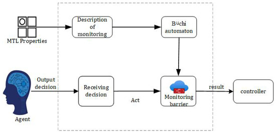 The ability of a CPS real-time system to react to surrounding data in a timely and accurate manner and then hand it over to the controller for response is critical to safe system operation. It is also possible to quickly determine whether the system will be impacted in a way that is not expected. To monitor the system’s operation, a runtime monitoring barrier was established. Its safety was verified for various safety properties, i.e., whether the safety constraints were violated and that the controller performed safe operations. Figure 5 depicts the structure of the monitoring barrier.
