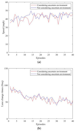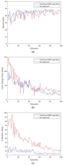 Figure 7 shows that the car’s behavior was ideal. Figure 7a shows the average speed obtained by the algorithm in each round of training. As the number of rounds increased, the average speed was closer to the speed threshold, and the vehicle agent could complete the route task more efficiently. The vehicle’s speed was greatly improved in the 20th round of training. At the same time, when the training round reached 72 rounds, the safety RL algorithm could achieve speed stability faster; Figure 7b shows the number of lane-changing events in each round. The frequency of lane changing was significantly reduced, and the average vehicle speed was increased. A faster speed was obtained by fewer lane-changing behaviors, and a faster speed in the task was met to reach the destination. Figure 7c shows the number of collisions per round. The number of intelligent vehicle collisions decreased with the increase in the number of training rounds, which indicated that the intelligent vehicle learned correct driving actions through exploration and RL, reducing the number of collisions.