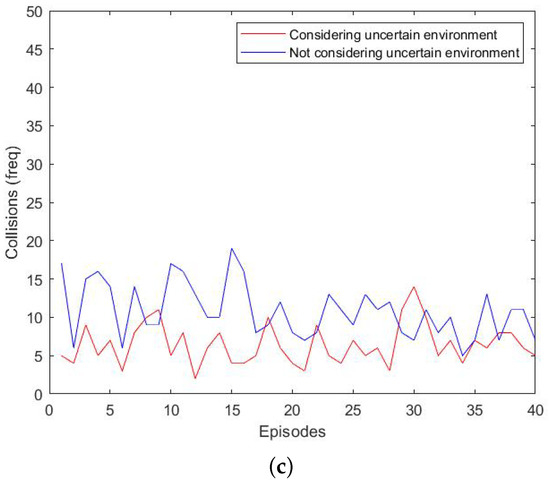 Figure 8 shows a comparison experiment between the monitor considering the effect of the nondeterministic environment and the case without it. We intercepted the data from rounds 0–40. In the figure, we compared the effect of considering environmental factors with not considering environmental factors and analyzed the first 40 rounds with significant differences. Our method showed a significant reduction in the number of collisions; however, at the same time, the driving speed was slightly lower compared with the conventional method. This is because our method considered the uncertain driving style variation, and if there was a high probability of risk, it chose to follow the car, resulting in a lower speed.