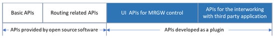 MRGW APIs provide programmable interfaces for accessing and controlling the MRGW to users and third-party applications. In addition to the various APIs provided by the open source software, the UI APIs for MRGW-control, based on the web interface and interworking APIs for external third-party applications, are provided. The overall API structure for the MRGW access and control is depicted in Figure 3 and is classified into two parts: APIs provided by the open source software and APIs developed as plugins.