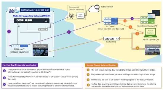 A commercial satellite access network (e.g., very-small-aperture terminal (VSAT) system) and a cellular access network (e.g., LTE system) are assumed to be accessible by each subscribed RAT end-device connected to the MRGW. In addition, the digital twin bridge of the on-land control center communicates with the digital bridge of the autonomous surface ship through the commercial satellite or cellular access network. This communication channel can be established through public Internet or a closed network (e.g., 5G private network) if available commercially or proprietarily deployed near a shore or at port.