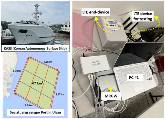 A field experiment was conducted to verify the operation and performance of the MRGW connected with an LTE end-device and an LTE device for testing in terms of traffic steering between different RATs in the testbed of the autonomous surface ship, known as KASS, plying along the navigation route next to the JangSaengPo port in Ulsan, Korea, as depicted in Figure 7.