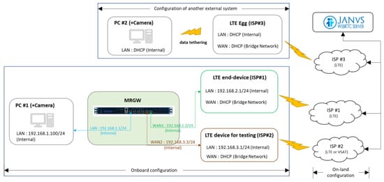 - The active-standby mode, shown in Figure 5, is configured using the MRGW, and the two RAT end-devices connected to the MRGW are the LTE end-device (ISP#1) and the LTE device for testing (ISP#2) for the interworking test.