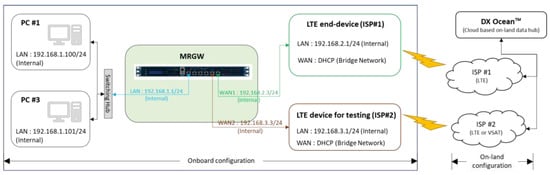 Three system configurations are considered to test the operation and performance of the MRGW. For the experimental validation, the expected potential operation errors or the breakdown of the MRGW are considered when each experiment execution process for three test scenarios is developed to enable such errors to be identifiable during the experiment by several methods (e.g., testing tools with ping or iperf to identify a hardware malfunction or a configuration error, testing with the DX Ocean™ for the data integrity check). The overall system configuration and experiment outcome analysis for the three test scenarios are provided in following subsections.