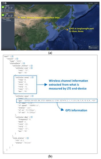 The experiment outcome for test scenario 3 is shown in Figure 15. As shown in Figure 15a, the DX ocean™ shows the ship location based on the GPS information which the MRGW obtains from the LTE end-device (ISP#1) and subsequently sends it to the DX Ocean™ (onboard equipment). The DX Ocean™ (onboard equipment) sends the stored data out to the DX Ocean™ (cloud-based on-land data hub) every 30 s. The period of the data sent out from the DX Ocean™ (onboard equipment) to the DX Ocean™ (cloud-based on-land data hub) is configurable. Figure 15b is the sample of collected data related to the wireless channel status information from the MRGW. Based on the experiment outcome, we found that the information collected from the MRGW is successfully stored in the DX Ocean™ (onboard equipment and cloud-based on-land data hub).