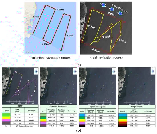 Experiment outcome of LTE end-device (a) navigation route in front of JangSaengPo port in Ulsan, Republic of Korea; (b) measured LTE performance.
