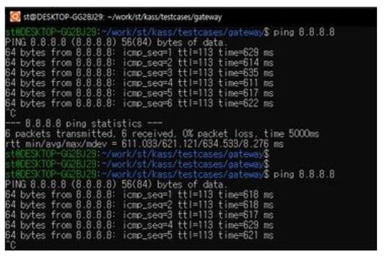 The overall system configuration for test scenario 1, described in Figure 10, shows the allocated IP addresses used for the validation experiment. The data used for the test scenario are ICMP (Ping) messages generated at PC #1 every second and a public DNS address (i.e., Google public DNS: 8.8.8.8) used as the targeted IP address of the ICMP message.