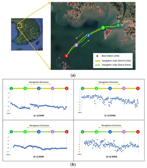 Experimental outcome of LTE end-device (a) navigation route in front Jeongok Port in Hwasung city, Republic of Korea; (b) measured LTE performance (RSRP, RSRQ).