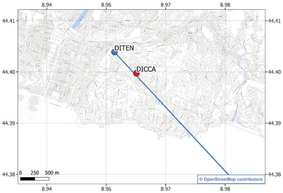 The location of the SRS dish at the University of Genova—DITEN department (blue circle, Lat: 44.4031; Lon: 8.9587; Altitude 70 m.a.s.l.) and TBRG at the Hydraulic Laboratory of the University of Genova—DICCA department (red circle, Lat: 44.3998; Lon: 8.9636; Altitude 45 m.a.s.l.). The blue line represents the ground projection of the path from the dish toward the Turksat 42° E constellation, chosen for this research.