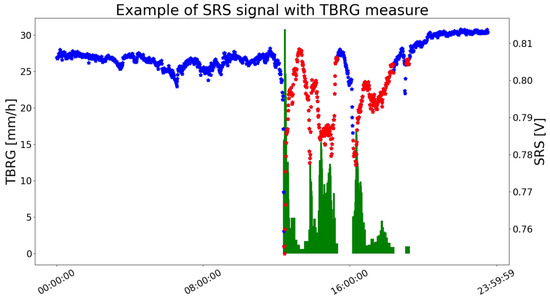 Example of one day signal collected by the SRS system with the TBRG reference. The histogram in green represents the measurement of the TBRG in mm/h. The dots represent the readings from the SRS system: they are marked in blue when the TBRG output is zero, and they are marked in red otherwise.