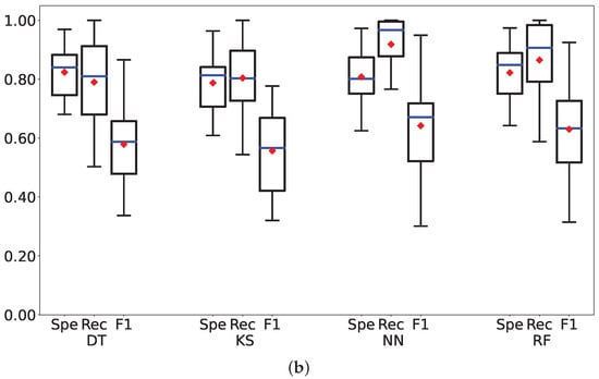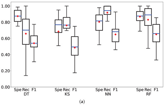 For each classification algorithm (from left to right DT, KS, NN, RF) trained with 12 features (top: (a)) and 6 features (bottom: (b)) a triplet of boxplots is shown, reporting the specificity (Spe), recall (Rec), and F1-score (F1) metrics, respectively. (a) Boxplot of the metrics using 12 Features. (b) Boxplot of the metrics using 6 Features.
