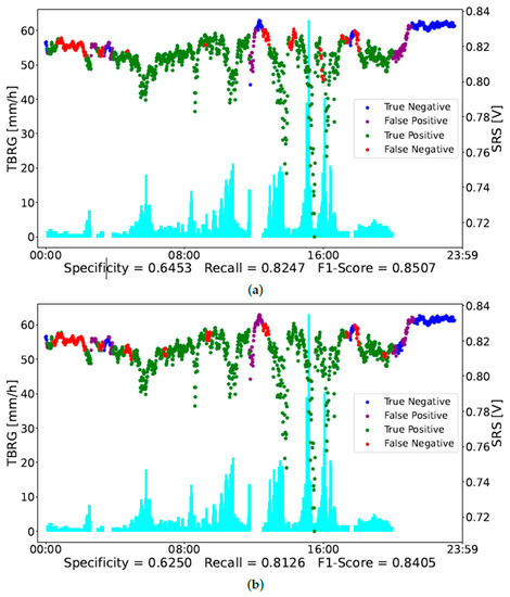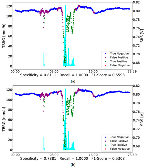 Figure 4 and Figure 5 report an example of the classification of two days of observations, i.e., day 11 and day 17 in Table 1, respectively. In Figure 4, the red dots, representing a misclassification of rain conditions, correspond to a low intensity of rain measured by the TBRG. On the other hand, the more intense rainy observations are well-classified by the NN. The purple dots point out a misclassification in non-rainy observations. As mentioned above, specificity could be not that accurate since the rain gauge is not close to the SRS. Indeed, the misclassified observations occurring around 12:00 seem to be related to a rain event that has not been detected by the TBRG.