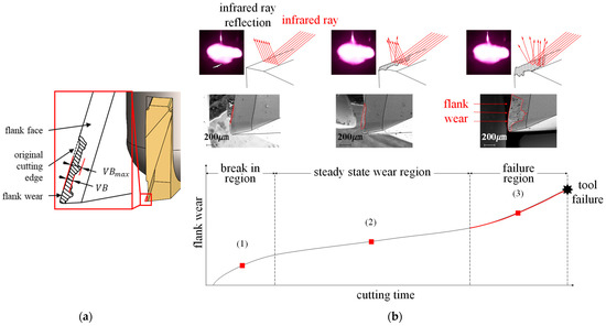 Because the rotating tool is defined as one surface, all tools with a certain speed or higher can be applied, and the rotating state can be measured without separating the tool from the machine tool. Tool wear comprises a combination of wear types that occur when cutting, including fatigue wear, diffusive wear, plastic deformation, and adhesive and chemical wear. The combination of tool and workpiece materials employed exerts a critical influence on tool wear. Furthermore, even if the material combination is appropriate, wear characteristics may differ depending on the complex nonlinear relationships among the cutting parameters, workpiece, machine, and cutting tool characteristics, as well as the use/non-use of cutting oil and the cutting environment [2,8]. The two dominant types of typical tool wear are crater wear and flank wear. Crater wear refers to the wear of the rake face owing to its contact with the chip and is caused by the heat generated due to the friction between the two during cutting. This heat causes chemical reactions that spread between the tool and the material. Crater wear can occur if the spindle speed is too low or if the feed speed is too high [18]. Flank wear is caused by contact between the workpiece surface and the flank face, forming a wear land on the flank face of the tool through the abrasion of the machined surface and the tool blade during cutting [19]. Figure 1a depicts the flank wear of a tool. Flank wear has been widely used as a measure of general tool wear to establish the effective life of the tool. In the case of regular wear, a flank wear of VB = 300 μm is typically used as the standard for tool life. In the case of irregular wear, scratches, or severe grooves, VBmax = 500 μm is used.