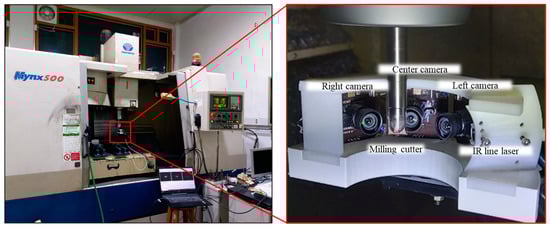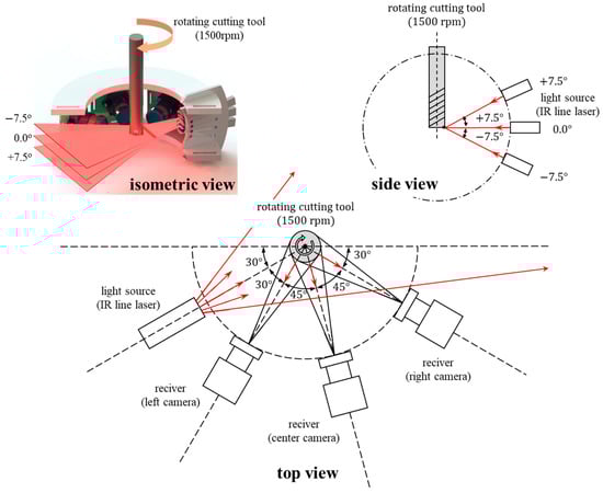 Figure 2 shows the configuration of the IR reflection measurement device proposed in this study. The center of the tool was set as the focal point for the IR light source, and an IADIY LM9IR940H50/L IR line laser with a laser light source was placed to irradiate the focal point at angles of −7.5°, 0.0°, and +7.5° relative to the vertical plane (parallel to the tool axis).