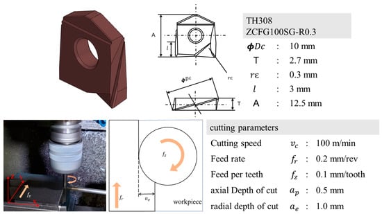 The tool used in the experiment was TH308 ZCFG100SG-R0.3 (Mitsubishi Hitachi). Figure 4 shows the information of the milling insert cutter and experimental cutting conditions, which were determined by referring to the manufacturer’s recommendations for gradual wear. The cutting speed (), feed rate (), feed per tooth (), and radial depth of cut () when machining was set to , , , and , respectively. The axial depth of cut was changed arbitrarily, considering the cutting speed and feed rate. If the manufacturer-recommended value for , , was selected, the flank wear would be the same as the nozzle radius of the tool, making it difficult to form wear on the tool’s marginal surface. Therefore, an value of 0.5 mm, five times larger than the recommended cutting condition, was selected to produce sufficient wear. In the experiments, dry machining with the downward cutting of a 100 mm × 100 mm × 40 mm SDK-11 workpiece was performed while monitoring tool wear. Downward cutting was selected because the wear rate of the tool is faster in downward cutting than upward cutting. Table 1 shows the chemical composition of the workpiece.