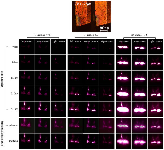 Figure 6 shows the reflected IR images for a measured tool flank wear of 197 according to exposure time and light source angles of −7.5°, 0.0°, and +7.5°. Note that these are low dynamic range (LDR) images, each of which clearly lacks a detailed representation of the reflection.