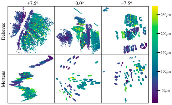 The reflected IR images measured from the left, center, and right cameras of the measurement device were converted into grayscale images after applying the Mertens or Debevec method. These converted images were stacked sequentially and used as a single input dataset comprising 240 × 240 × 3 images. The input data were compressed into two-dimensional vector form after passing through two convolutional layers comprising 32 and 64 filters. Next, the data were passed through the deconvolutional layers to generate a set of 240 × 240 × 3 images, which is the original form. Figure 8 shows the dimensional reduction results for the data compressed using the trained VAE model. When the dataset was clustered, a significant difference was observed between the results obtained using different data preprocessing methods, with the Mertens method clustering the dataset better than the Debevec method at all light source angles. Furthermore, the lower the position of the light source (i.e., as the light source angle decreased from +7.5° to −7.5°), the better the clustering. Indeed, the best clustering performance was obtained when the Mertens method was applied to the IR reflection image data measured using a light source angle of −7.5°.
