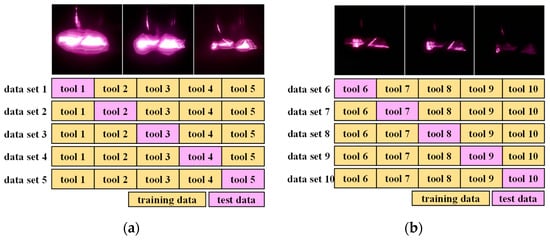 The data preprocessing and tool-wear-measurement method proposed using the VAE model were evaluated using the tool wear dataset compositions shown in Figure 9. In this evaluation, ten identical tools were used to conduct cutting exercises. The IR reflection images of tools 1–5 were collected from various angles using the device described in Section 2. Owing to the wide spread of the light source, the light was reflected from the worn regions of the tool, as well as other regions. Considering that the tool wear region was extremely smaller than the size of the entire tool, more light was captured from the non-worn region, causing bleeding when measuring the reflected IR light. To prevent this bleeding, near-infrared polarization filters were mounted on the light source and camera lens when collecting the reflected IR images of tools 6–10.