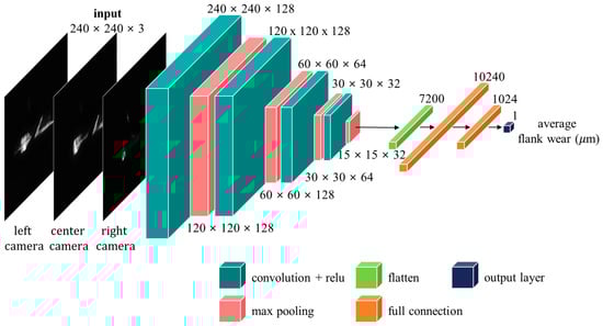 The K-fold cross-validation method was employed to construct the training, evaluation, and test datasets. Thus, the data collected for tools 1–5 were used to derive five datasets for training and evaluation; in each dataset, one tool was used for the test data, while the remaining tools were used for the training data. The training and evaluation were performed for tools 6–10 in the same manner. Figure 10 shows the detailed architecture of the proposed multi-view CNN model for tool wear estimation. The input data first passed through the convolutional layers comprising 128, 128, 64, and 32 filters and pooling layers, resulting in a 15 × 15 × 32 dataset. The kernel sizes were 3 × 3 and 2 × 2. The result was transformed into a 1 × 7200 dataset to output the estimated tool wear. The fully connected layer was connected using 10,240 and 1024 nodes. As the proposed model was intended to output the tool wear in μm, a linear function was used as the activation function for the final output layer.