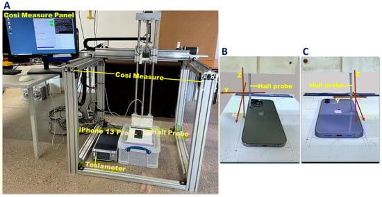 Setup used for mapping the static stray magnetic field of the iPhone 13 Pro, the iPhone 12, and the MagSafe wireless charger. A: For measuring the stray magnetic field of the target device a three-axis Hall probe (FP-2X-250-ZS15, Lake Shore Cryotronics, Westerville, OH, USA) was connected to a teslameter (Model F71, Lake Shore Cryotronics, Westerville, OH, USA). For spatial mapping of the stray magnetic field, COSI Measure was used to control the sample trajectory of the Hall probe (A). B,C: The Hall probe was placed perpendicular to the plane of the iPhone 13 Pro (B) and iPhone 12 (C).
