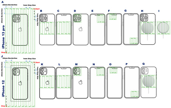Sampling trajectory of the Hall probe used for magnetic field mapping of the iPhone 13 Pro, the iPhone 12, and the MagSafe wireless charger with a 1 mm in-plane spatial resolution. Yellow dashed lines represent the trajectory of the Hall probe using a 1 mm step size. A,J: Sampling trajectory used for full coverage of the iPhone 13 Pro (A) and iPhone 12 (J) with a field of view FoV = 100 × 180 mm. B,C,K, and L: Sampling trajectory tailored to the annular array of magnets of the iPhone 13 Pro (B: back, C: front) and of the iPhone 12 (K: back, L: front) using an FoV = 62 × 62 mm. D,E,M, and N: Sampling trajectory used for B-field mapping of the camera of the iPhone 13 Pro (D: back, E: front) and of the iPhone 12 (M: back, N: front) using an FoV = 40 × 40 mm. F,G,O, and P: Sampling trajectory used for B-field mapping of the speakers of the iPhone 13 Pro (F: top, G: bottom) and of the iPhone 12 (O: top, P: bottom) using an FoV = 30 × 30 mm. H,I, and Q: Sampling trajectory used for B-field mapping of the iPhone 13 Pro placed on the MagSafe charger (H), the iPhone 12 placed on the MagSafe charger (Q), and of the standalone MagSafe charger (I) using an FoV = 62 × 62 mm.