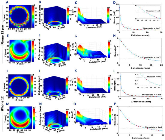 In Figure 4, Figure 5, Figure 6 and Figure 7D,H,L,P, the decays of the stray magnetic field as a function of the z-distance were fitted with the cubic spline interpolation (blue line) to highlight the R−3 dependence of Bmax from Equation (2). The corresponding maximum values of the stray magnetic fields, along with the distances at which the 1 mT threshold was reached are shown for the iPhone 13 Pro in Figure 4D,H, and for the iPhone 12 in Figure 4L,P, back and front, respectively. Three-dimensional views of this dependence for the annular array of permanent magnets are shown for the iPhone 13 Pro (Figure 4C,G) and iPhone 12 (Figure 4K,O), back and front, respectively.