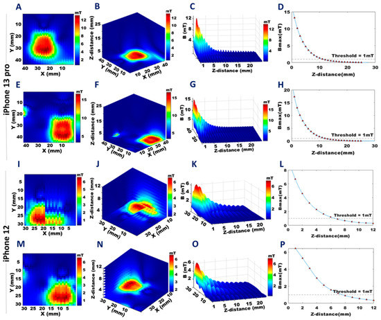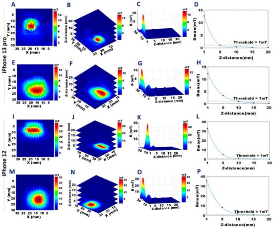 Distribution of the stray magnetic field of the cameras of the iPhone 13 Pro and the iPhone 12. The colors represent the strength of the magnetic fields and are scaled to the maximum B-field of each data set. A,E,I, and M: The 2D distribution of the stray magnetic fields of the cameras for a transversal plane located at a distance of 1 mm from the back (A), (I) and from the front (E), (M) of the iPhone 13 Pro and the iPhone 12. B,F,J, and N: The 3D distribution of the stray magnetic fields of the cameras covering a z-distance of z = 1–25 mm from the back (B), (J) and at z = 1–12 mm from the front (F), (N) of the iPhone 13 Pro and the iPhone 12. C,G,K, and O: The 3D stray magnetic field (B) variation with the increasing z-distance from the back (C), (K) and front (G), (O) of the iPhone 13 Pro and iPhone 12’s cameras, respectively. D,H,L, and P: Maximum stray magnetic field (Bmax) versus the z-distance from the back (D), (L) and from the front (H), (P) of the iPhone 13 Pro’s camera and the iPhone 12’s camera.