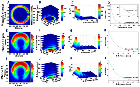 A closer examination of the MagSafe charger (Movie S4) alone showed Bmax = 108.4 mT at 1 mm (Figure 7A), decreasing to B ≤ 1 mT at 25 mm (Figure 7B–D). When the iPhone 13 Pro was placed on the MagSafe charger, the stray magnetic field obtained was Bmax = 7.2 mT at 1 mm distance from the back surface of the MagSafe charger (Figure 7E), decreasing to B ≤ 1 mT at 20 mm (Figure 7F–H). When the iPhone 12 was placed on the MagSafe charger, Bmax = 7.2 mT at 1mm from MagSafe charger back surface (Figure 7I), decreasing to B ≤ 1 mT at 20 mm (Figure 7J–L).