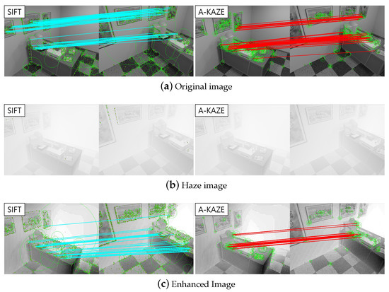 Lastly, we evaluated our method via feature detection results. The Scale Invariant Feature Transform (SIFT) feature proposed by Lowe [40] and KAZE feature proposed by Alcantarilla et al. [41] were used for feature extraction and matching. SIFT reported stronger matching results as can be seen in Figure 11. Compared with the original haze-free image of the synthetic dataset, the detection results of haze and dehazed images are shown in Figure 11. The quantitative comparison result is in Table 4. From Figure 11c and Table 4, feature detection results are much better in dehazed images. Although the number of inliers slightly decreased, the inlier ratio was higher than the original. This aspect seemed to be achieved from the fact that small textures became smooth and strength feature points were restored after dehazing. Other quantitative comparisons were also provided in Table 5. We tested the computation time of the proposed method compared to conventional model-based approaches [6,7,8,9,37]. The test image size was fixed to the VGA (640 × 480) size. As reported in the table, the proposed method showed efficiency on the computation.