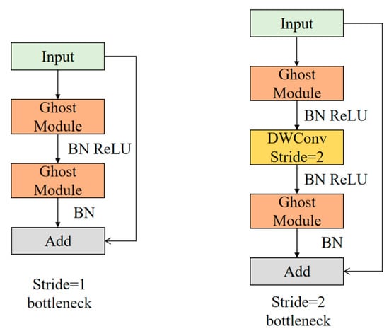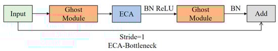 - As an example, when stride = 1 in the Ghost Bottleneck module, the ECA module is embedded in the Ghost Bottleneck module after the first Ghost Module, and the improved ECA–Bottleneck module is used to form the ECA–GhostNet backbone network to improve the feature extraction capability of the network. The structure of the improved ECA–Bottleneck module is shown in Figure 7.