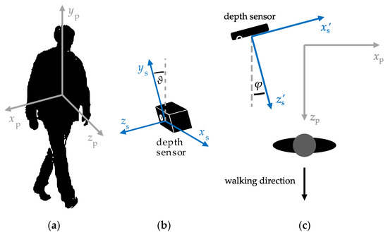 The angle ϑ between the sensor’s ys axis and the examined person’s yp axis (Figure 2b) can be estimated by identifying the ground plane, e.g., using the RANSAC algorithm [44]. Algorithms for this purpose are implemented in popular devices comprising depth sensors such as the Microsoft Kinect devices [45]. The corresponding rotation of the coordinate system can be described by the following formula: