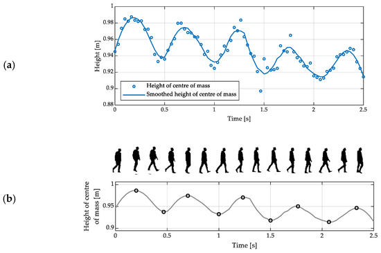 Figure 4. (a) Exemplary estimates of the height of the examined person’s centre of mass during walking, obtained using a depth sensor, and the results of their smoothing using a Savitzky-Golay filter; (b) an exemplary dependence of the height of a walking person’s centre of mass on time, with its local extrema indicated with circles and the corresponding silhouettes of that person extracted from the depth images. - 2