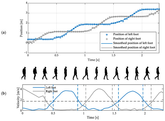 Figure 5. (a) Exemplary estimates of anteroposterior positions of a walking person’s feet, obtained using a depth sensor, and the results of their smoothing using a Savitzky-Golay filter; (b) Exemplary dependences of the horizontal velocity of a walking person’s feet on time, with the empirically selected threshold value indicated by the horizontal dashed line, the detected FO and FC moments indicated by the vertical dashed lines, and the silhouettes of that person extracted from the corresponding depth images. - estimation of the horizontal velocity of the feet by numerical differentiation of the sequences of position estimates;