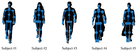 The spatiotemporal parameters were estimated for 5 subjects: 3 women and 2 men, aged 22–45, free from gait disturbances. Subjects #1–#3 wore typical trousers, Subject #4—wide-leg trousers, and Subject #5 wore a skirt. Some anthropometric information about the subjects is collected in Table 1. An exemplary silhouette of each subject is shown in Figure 6. It can be seen in Figure 6 that the localisation of knees, ankles and feet is hindered in the case of these particular silhouettes of Subjects #4 and #5 because of their clothing.
