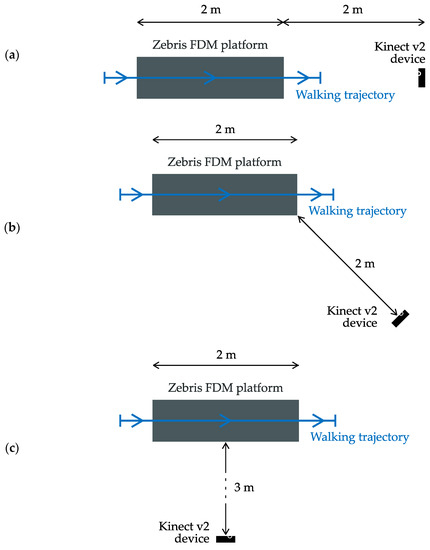 Two sets of data were collected in order to assess the uncertainty of the estimates of spatiotemporal gait parameters obtainable using the three data processing methods described in Section 2.1. The data were collected using a Microsoft Kinect v2 device. Among various types of devices comprising depth sensors, the Kinect v2 device seems to be the one most commonly considered in research studies related to health care applications of such sensors (cf. the review of literature in Section 1), although it has not been produced since 2017. The use of Kinect v2 is convenient because this device provides estimates of positions of anatomical landmarks without the need to purchase additional software packages. The reference data were collected using a 2-m long Zebris FDM platform.