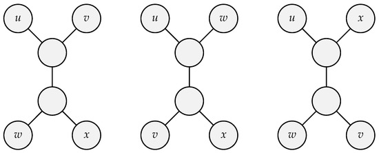 So, the implementations of the quartet method described below use greedy algorithms to have an approximation to it. We describe the quartet method as, from our collection of n elements, we consider each group of four items. Therefore, the total number of groups is . A tree is then built from each group , and each internal node has three neighbors, implying that the tree comprises two subtrees with two leaves each. Let this tree be called a quartet. There are three possible dispositions for a quartet: , , and , where each pair of letters represents the leaves connected to the same internal node as shown in Figure 1.