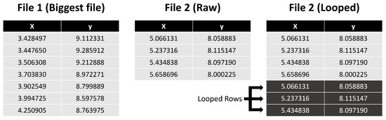 To circumvent the problem of the files being differentiated due to their different size, a separate dataset was built from the raw one (after the headers were removed) in which each file had the same number of lines. To have a reasonable number of line representatives, the same number of lines per file was accomplished by looping the smaller files and repeating them line by line until all the smaller files were the same size as the largest one—see Figure 2. Note that in this case, we are, on the one hand, not influencing the results dramatically, as the movements are expected to be repetitive. From the Kolmogorov complexity point of view, the information is the same as the smallest information in the initial pattern. Furthermore, in fact, to validate this method’s results, it was essential to observe that files will be clustered together based on their compressed size. Although not always, with state-of-the-art compressors, files with larger original sizes tend to have larger compressed sizes, and files with smaller original sizes tend to have smaller compressed sizes. Therefore, to have a term of comparison, we examine clusters formed using the actual file sizes, so we can later compare them to clusters generated using file compressors and see their impact on the groups created.