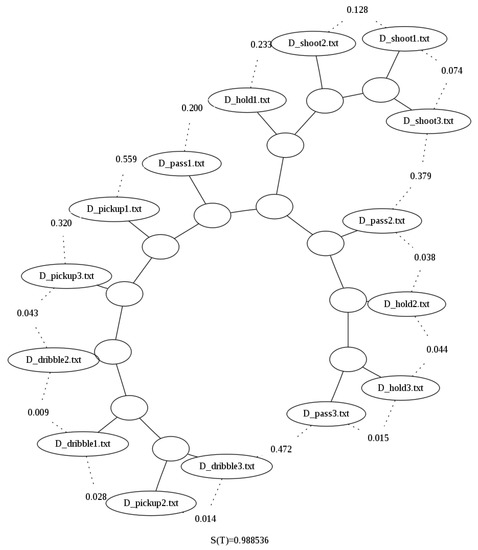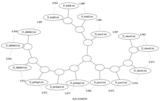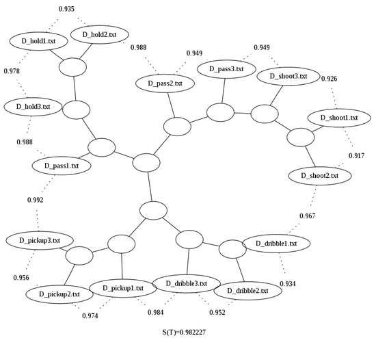 The improvement of the results can also be seen in the binary tree image generated for the compressed by column option presented in Figure 4. When compared with Figure 5, for example the latter does not cluster properly dribbles and pickups, i.e., it does not correctly separate them by grouping them all in one branch of the tree, while in Figure 5, these two actions are now in distinct branches.