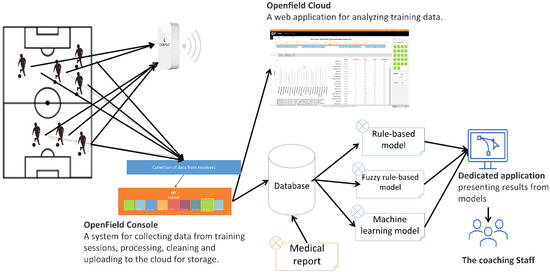 The Catapult system allows the analysis of the players’ performance in individual parameters in real-time, using a data receiver, or after a training session, the data are ripped using the dedicated Catapult OpenField Console software. At this stage, coaches mark individual training sessions and clean the data to training time ranges. Once this is done, the data are sent to a central application maintained in the cloud and additionally to a dedicated database. This database also stores information from medical reports. The process is shown in Figure 3.