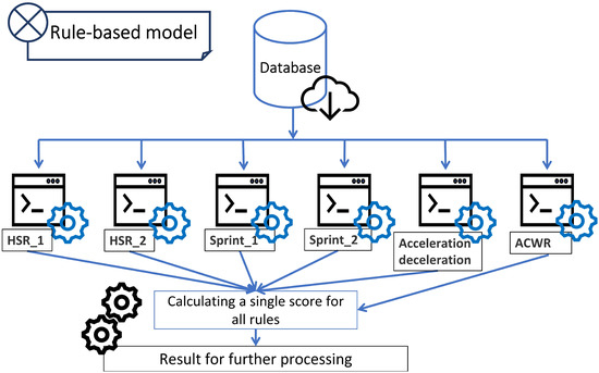 Current studies in the publications deliver an insufficient understanding of what mostly affects injury risk, while an evaluation of the potential of statistical models in forecasting injuries is still missing. Based on research conducted so far, too high and too low training load leads to a higher risk of an injury occurrence [7]. An additional risk factor is changes in training load volume in microcycle’s series [4]. Both internal and external load parameters are correlated with the risk of an injury occurrence, however, some of them are more impactful, thus feature selection is one of the most important steps in this kind of experiment. In [8] authors presented a systematic review of methodology in practical injury prevention based on Acute: Chronic Workload Ratio. It compares different approaches to calculating the ACWR, e.g., using a rolling average, coupling methods, or EWMA (Exponentially Weighted Moving Average), which sets an increased weighting to the more recent workload values. Some of the compared studies show a relationship between increased ACWR and the risk of injury. However, the finally adopted methodology depends on the specificity of the research and its limitations. On the other hand, [9] presents a comparison of studies on injury risk assessment using elements of machine learning. This research concerns football players from different leagues, and seasons and uses a different set of parameters, e.g., external and internal load parameters. According to this research, machine learning does not seem to have high predictive power in every setting, nevertheless, it can support the identification of early symptoms of raised risk for an injury. Both reviews show different approaches to the issue of injury prediction and make it possible to refer to our approach, which is distinguished by the use of both machine learning methods, fuzzy systems, and a decision-making model based on expert knowledge. Our study is also characterized by limitations related to the dataset, therefore it uses only parameters related to external loading.