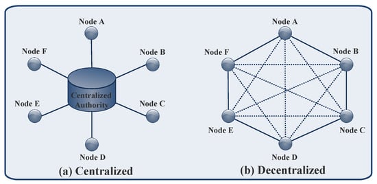 Blockchain technology has a decentralized structure [12,77], where there is no central node/authority to store data. Moreover, in blockchain technology, transactions are not validated and authorized by a centralized authority as in a centralized system. Figure 2 depicts the framework of a centralized and decentralized system. The benefits of this feature are that: (1) it provides a trustless environment, thereby reducing maintenance costs. However, the participation of centralized authority requires maintenance costs and creates performance issues, and (2) a real-time, shared view of the data is available to all entities. Furthermore, blockchain technology employs cryptographic algorithms to maintain records and authentication in a distributed environment.